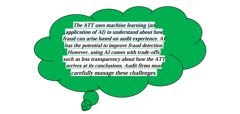 • Evaluating Journal Entries: Financial reporting fraud frequently involves management circumventing internal controls to post fictitious journal entries, for instance. Auditors are increasingly using ATT to classify the population of journal entries in order to detect entries that appear inappropriate or unusual. Auditors determine the filters (and the relative significance allotted to each filter) based on their expectations of how fraudulent The ATT uses machine learning (an application of AI) to understand about how fraud can arise based on audit experience. AI has the potential to improve fraud detection. However, using AI comes with trade-offs, such as less transparency about how the ATT arrives at its conclusions. Audit firms must carefully manage these challenges. 6 | Page entries could arise for the audited entity (e.g., posted by senior management who rarely post journal entries, etc.). Using ATT to identify journal entries of audit interest among thousands of entries is more efficient than visual inspection.